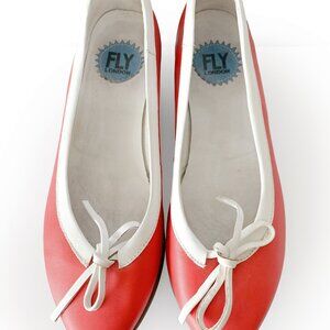 Fly London red leather pointed toe kitten heels with white bows. Some wear on heels, but the rest of the soles are in very good condition. One small scuff on the right side of the right heel (shown in pictures). Overall, good used condition.