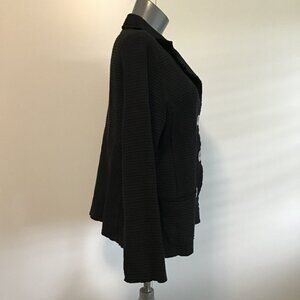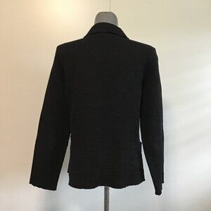 Black 100% cotton waffle weave blazer style jacket with beautiful, oversized buttons and front pockets, in a relaxed silhouette. A year-round staple, this jacket is perfect for cool summer evenings or a spring or fall staple.