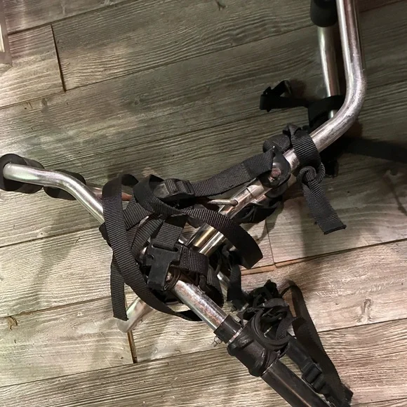 Heavy-duty foldable metal bike rack. Multiple adjustable black straps secure bikes. Compact, collapsible design for easy storage. Durable metal construction with black nylon straps.