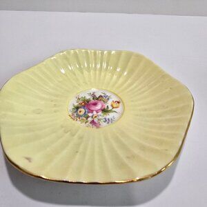 Beautifully crafted English Foley Teacup and saucer set with delicately ruffled soft yellow teacup and saucer accented with striking floral detailing. This set is an absolute gem and would be a beautiful addition for any collection.