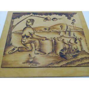 Folk Art Handmade Pig Roast Scene Wood Burned Plaque Kitchen Cabin Decor