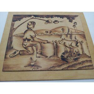 Capture the essence of rustic creativity with this one-of-a-kind Folk Art piece, featuring a charming pig roast scene meticulously crafted through the traditional technique of wood burning. The artistry behind this original work showcases a unique vision, with each detail etched into the wood, giving it a timeless appeal that complements any setting.