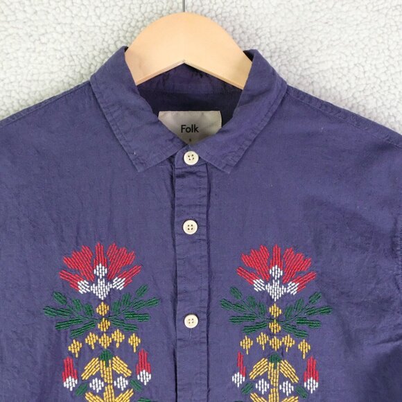 Folk Shirt Mens Small Blue Button Up Embroidered Native Southwestern Linen