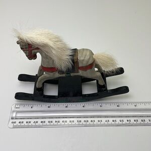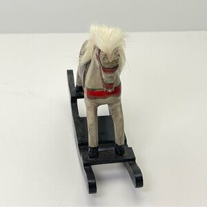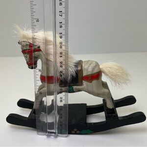 Hand carved hand painted vintage antique style rocking horse. Horse is aged and has the crackle look to the paint, see close ups of the face of horse. Painted with a Christmas theme. Hair is real unsure of animal.