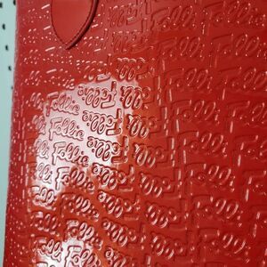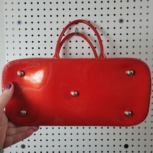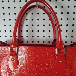 Fabulous red hot patent handbag by Follies with signature logomania embossing all over the exterior and signature print red clean lining throughout the interior 3 main compartments. Zipper closure on the middle of those 3 compartments. Some smaller pockets within also. Studs on base.