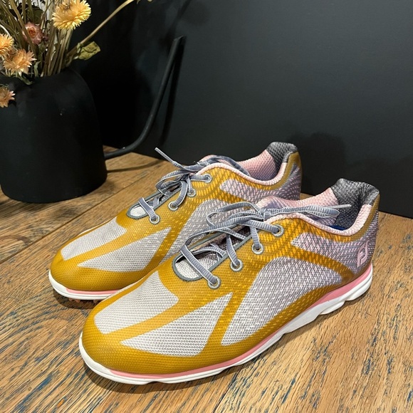 Souliers de golf FootJoy pour femme, taille 9, en maille légère et respirante. Combinaison de couleurs vive et sportive : jaune moutarde, gris et rose, avec semelle blanche et crampons orange.