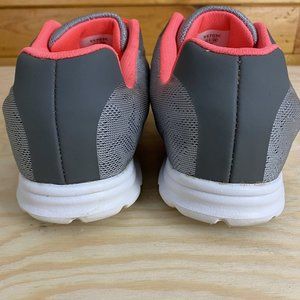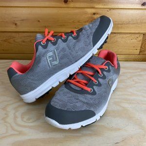 Stylish FootJoy athletic shoes. Gray mesh upper with pink accents. Comfortable and durable design.