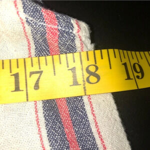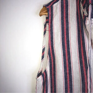 Striped beach coverup in red/white/blue. Gauzy with hood and front ties. Slouchy pockets, sleeveless and v-neck.