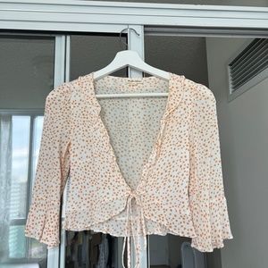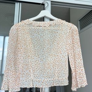 A starry printed top on rayon crepe fabric featuring a front tie detail, plunging neckline and ruffle detailing throughout. Pair with high-rise denims for a summery finish.