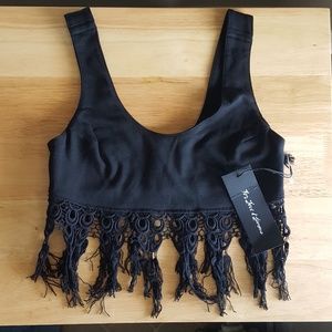 A sultry cotton-feel cropped tank top, trimmed with fringed lace. An exposed zip fastens the open back. Scoop neckline. Lined.