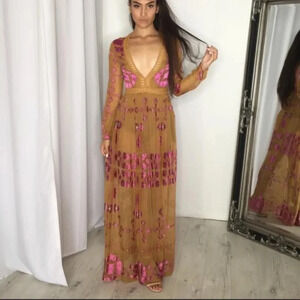 For Love & Lemons Barcelona Maxi Dress Silk Blend Mustard Yellow Sz XS