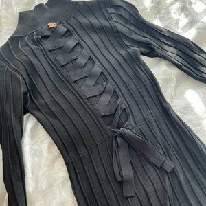 This dress by For Love & Lemons is really cute. Made of a stretchy ribbed fabric, t's not too thick so you can wear it any time of year. Has a sporty vibe to it. Worn only a couple times. The back has a beautiful criss cross feature. 3/4 sleeves.