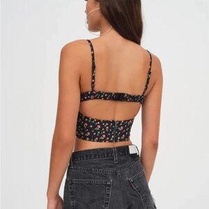 Floral crop top by For Love & Lemons. Black with rose pattern. Adjustable straps. Open back with hook and eye closure on top, and zipper closure on bottom. Size XS.