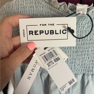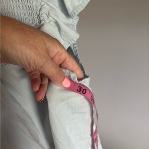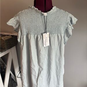 Chic light blue blouse with smocked yoke. Features ruffled sleeves and tie neckline.