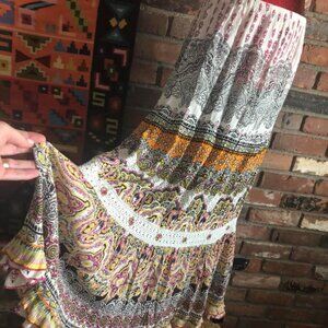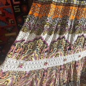 Multi-color Paisley. Crochet Lace. Gold Beads & Pink Gems. Festival Skirt.