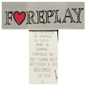 This made in Canada ForePlay Zip-Up Crop Top in Size Large is in excellent condition with no flaws. Measurements in photos - note measurements taken flat and unstretched. Waist, Hip and armpit to armpit (chest) is then doubled.