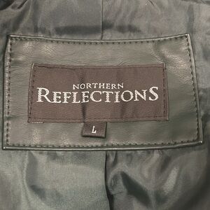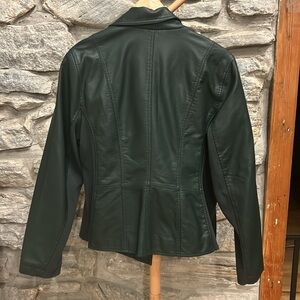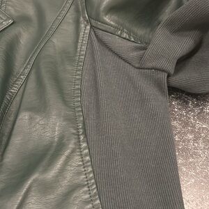 Chic vegan leather moto style jacket in a rich forest green hue. Features a sleek design with a front zipper and front zipper pockets. It has elasticized side panels and underside of sleeves. Ideal for stylish outings. Measurements in pics: pit to pit and length.