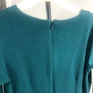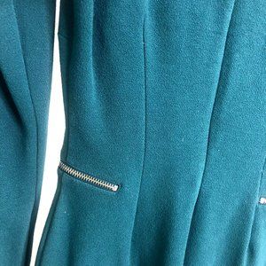 Teal coloured zipper dress, knee length, very stretchy, closed back. Says its size 0 but fits more like a 4-6.