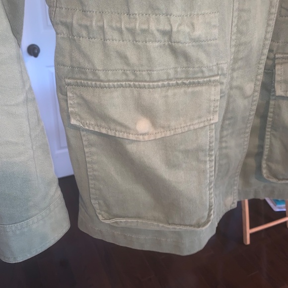 Women’s olive green utility jacket. It features a hood, zipper closure and multiple pockets.