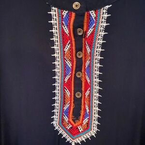 Forever 21 black 3/4 length shirt. Features colored pattern and buttons on the front. EUC - never worn.