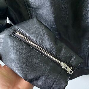 Chic black faux leather jacket with silver accents. Features asymmetrical zipper and stylish lapels. Ideal for a modern, edgy look.