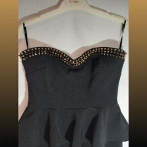 Solid black bodycon short peplum dress with gold studded bust . It's strapless with a sweetheart neckline and silicon stay tape to keep the bust up. Waist darts on the front and back skirt as well as bust darts on the front. Invisible zipper located at the center back.