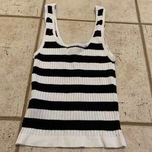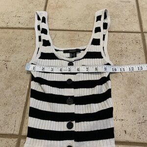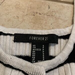 This is a stylish and versatile knit crop top from Forever 21. It features a classic black and white horizontal stripe pattern and a ribbed texture. The front has a full button-up closure with black buttons. This top is sleeveless with a scoop neckline and has a trendy cropped fit. It's a great piece for layering or wearing on its own.