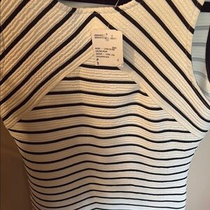 Chic and stylish, this sleeveless dress features a classic black and white stripe pattern. Perfect for any occasion, it offers a flattering fit and timeless design.