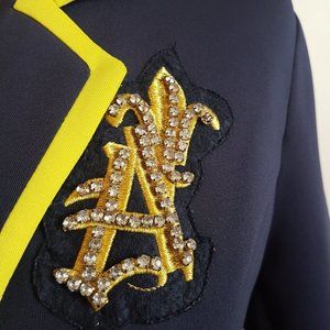 Eye-catching navy blazer with lime green accents and gold buttons.