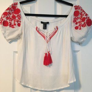 This is a slightly cropped peasant blouse with orangey/pink embroidery.