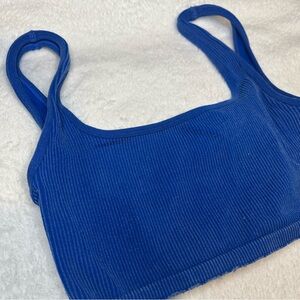 [Cropped blue tank, very stretchy material, worn under 3 times, recommended fit on a medium sized person (item fits slightly smaller than size says)]