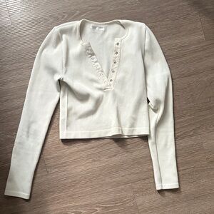 Chic ribbed top with button detail. Long sleeves for versatile styling. Ideal for casual or dressy looks.