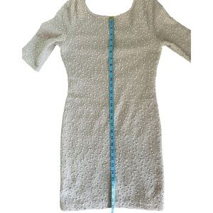 Forever 21 Body con mini-dress, cream coloured with little textured knots and clear sequins all over. Fully lined. Size medium. (Hard to photograph the sequin detail, but really shimmery and pretty) Boat neck with mid-length sleeves. The back has about a 9โ drop. Really cute party dress or for a wedding.