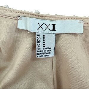 Forever 21 Body con mini-dress, cream coloured with little textured knots and clear sequins all over. Fully lined. Size medium. (Hard to photograph the sequin detail, but really shimmery and pretty) Boat neck with mid-length sleeves. The back has about a 9โ drop. Really cute party dress or for a wedding.