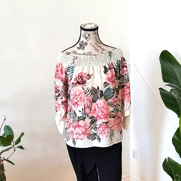 Forever 21 Elegant off-shoulder top featuring a beautiful floral design. Perfect for adding a touch of femininity to your wardrobe.
