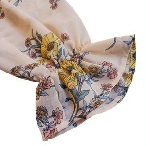 In very good condition. Lightweight sheer material. Flutter ruffle sleeve. Scalloped hemline. Floral Cottagecore peasant blouse.