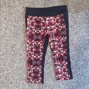 Crop legging features pink geometric print in the front and charcoal grey on the back. Super cute for a workout or lounging