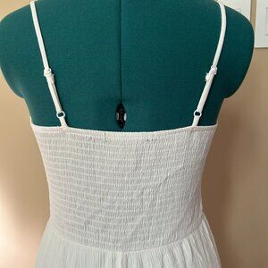 Perfect for a beach resort vacation. Forever 21 romper short/skirt one-piece - looks like a dress from the back. Built-in shorts add a layer to keep it non-see-through. Ivory/off-white in colour (not pure white). Like new condition - no rips, stains or fading. Shirring on back of allows for a comfortable fit without looking baggy. Adjustable straps. Shell 100% rayon. Lace embroidery 65% cotton 35% rayon. Measurements can be provided upon request.