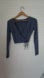 Soft wrap top with scalloped lace trim and tie waist in a cozy heathered blue/purple. Feminine, flattering fit perfect for layering or styling solo. Small stain and some piling as photographed