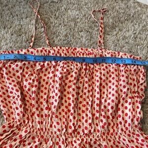 Cinched in bottom with Approximately 4” ruffle below Small spaghetti straps