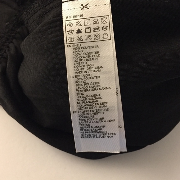 Women's Size Medium. Polyester. Black and Pink Floral. Chiffon shell with black lining. Criss-cross front with snap closure. Ruffled spaghetti straps. Elastic waist. Slit pockets.