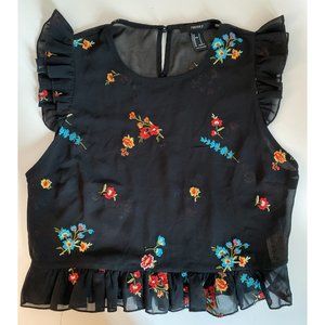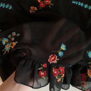 Really cute sheer crop top with embroidery. ♥ Fluttery, gathered fabric details at the shoulders and bottom hem; keyhole at the back neck. Peplum look at the waist. The embroidered flowers are sky blue, red, & yellow.