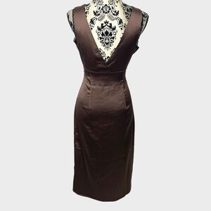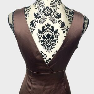 Sleek and stylish brown midi slip dress in a silky satin finish. Features wide straps, a softly gathered bust, black lace trim, and a flattering empire waist seam. Deep V-back and darted shaping create a fitted silhouette. Fully lined.