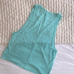 Turquoise blue mesh and striped athletic tank top. Stylish round neckline, wide arm holes and cropped length. In excellent condition