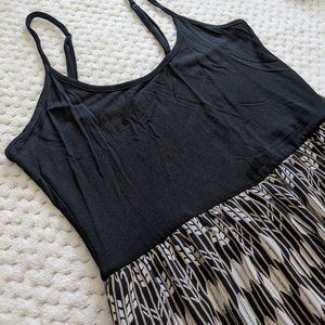 Adjustable spaghetti straps. Empire waist. Measures 13" across the chest when lying flat, but the material is super stretchy and will stretch to about 18" (would best fit a cup size A or B). The skirt is lined to mid-thigh. Total skirt length is 42".