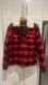 Vibrant red and black buffalo check plaid outer shell, and a fully black quilted interior.
