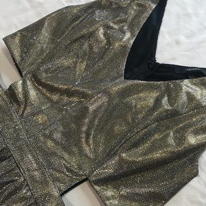 Forever 21 Metallic gold fit and flare dress with side cutouts. Worn only once. In excellent condition, other than a minor/subtle run in fabric on the lower right back side of bodice area above cutout (see last image). Size small.
