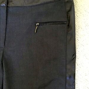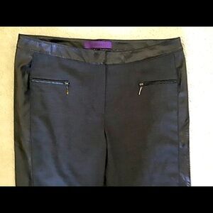 These pants are very cool! Strips of faux leather fabric down the side of each leg and at the top (front and back). Zippered pockets on front and stylish zippered detailing at the bottom of each pant leg. In excellent condition!