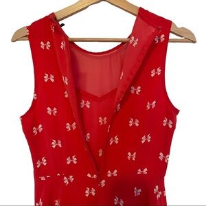 Forever 21 red sleeveless mini dress with white bow pattern. Half back zip, sheer upper chest, very cute and comfortable. Excellent condition. See photo for approximate measurements.