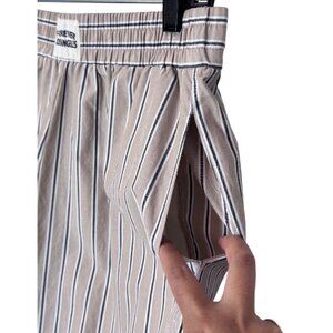 The matching shorts are a similar neutral tone with vertical pinstripes. They have a relaxed fit, an elasticated waistband, and an approximate mid-thigh length, resembling a comfortable resort or boxer short style.